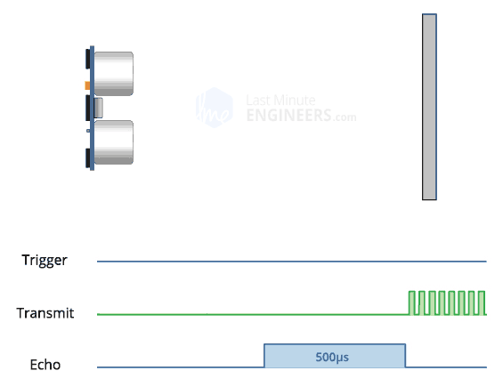 It all starts, when a pulse of at least 10 µS (10 microseconds) in duration is applied to the Trigger pin. In response to that the sensor transmits a sonic burst of eight pulses at 40 KHz. This 8-pulse pattern makes the “ultrasonic signature” from the device unique, allowing the receiver to differentiate the transmitted pattern from the ambient ultrasonic noise. The eight ultrasonic pulses travel through the air away from the transmitter. Meanwhile the Echo pin goes HIGH to start forming the beginning of the echo-back signal.