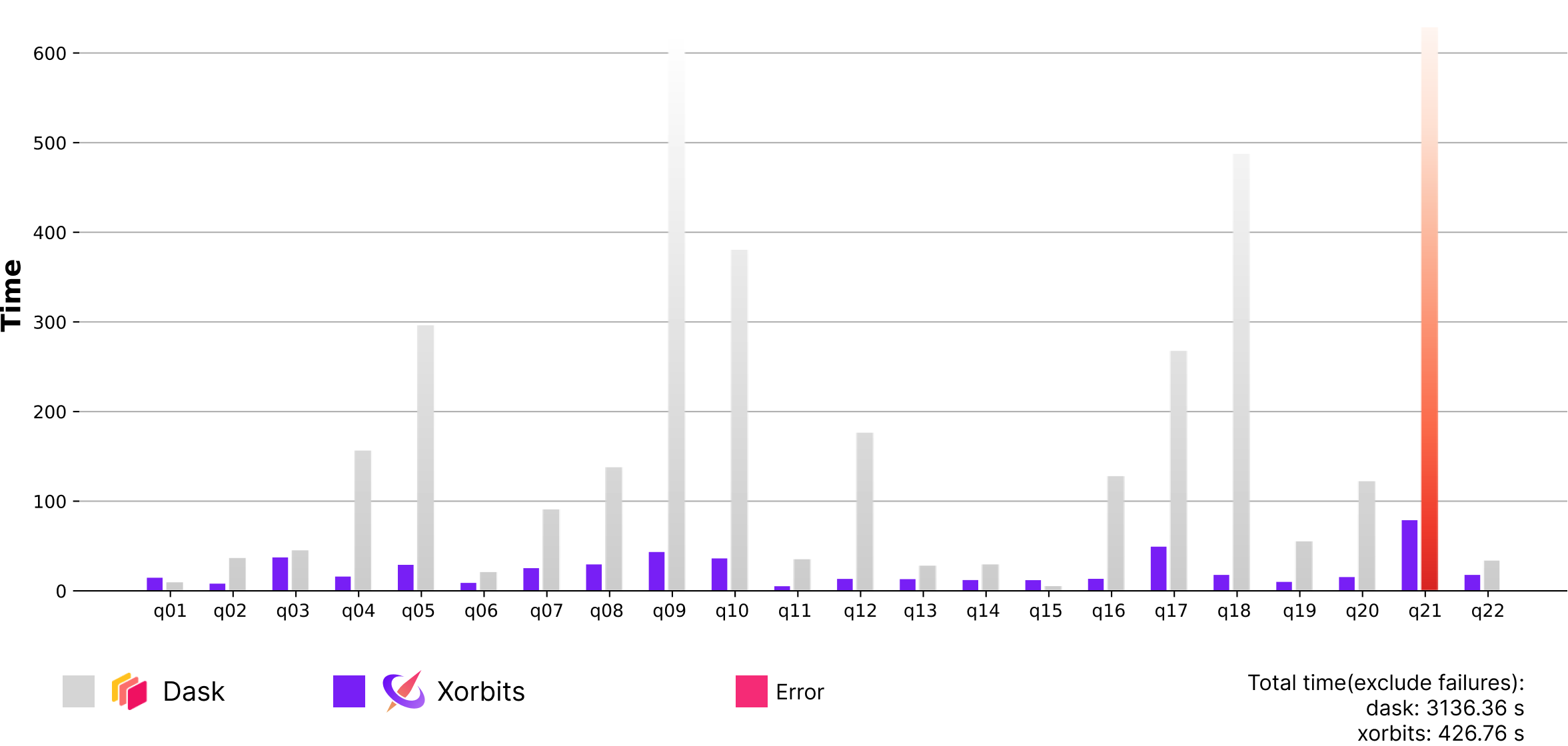 Q21 was excluded since Dask ran out of memory. Across all queries, Xorbits was found to be 7.3x faster than Dask.