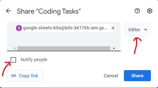 Most IMPORTANT Part: Sharing the Spreadsheets with the Google Service Account.