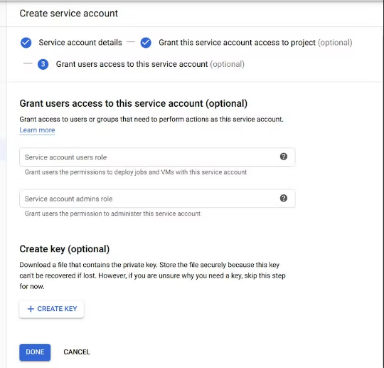 On the next dialog, you get an option to create a key. This is an important step. Click on the Create Key button and choose JSON as the format. This will ask you to download the JSON file to your local machine.