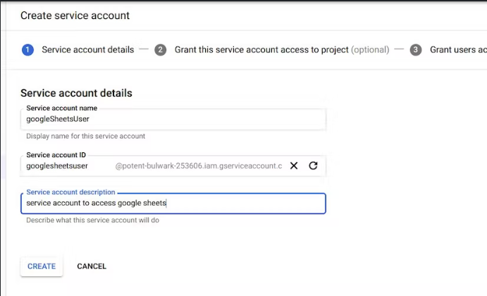 Google Service Accountto get access to the spreadsheets API. We have to enable Google Sheets API in our project on Google developers console.