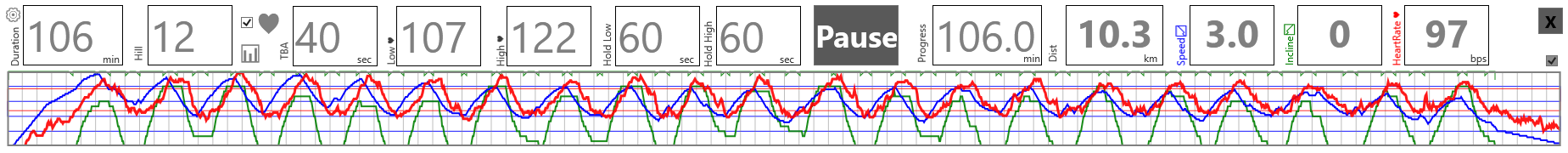 - Increase speed and incline (alternating) until upper heart rate target is reached ("Hill" maximum incline setting is obeyed!)