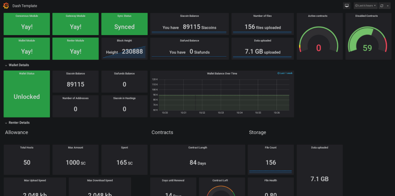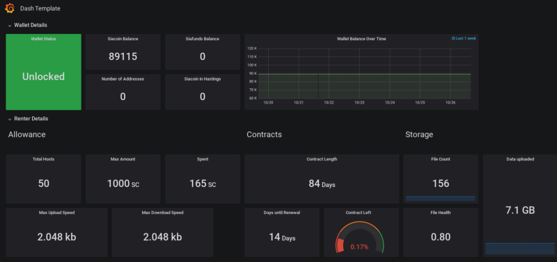 Grafana also integrates seamlessly with alerting tools such as PagerDuty, and AlertManager for more advanced alert use cases. It also offers cool features such as "kiosk" mode to keep your favorite dashboards on display in a public way. Got an extra tablet lying around, set it up to display your Sia status, wallet balance, free space, number of uploaded files, etc.