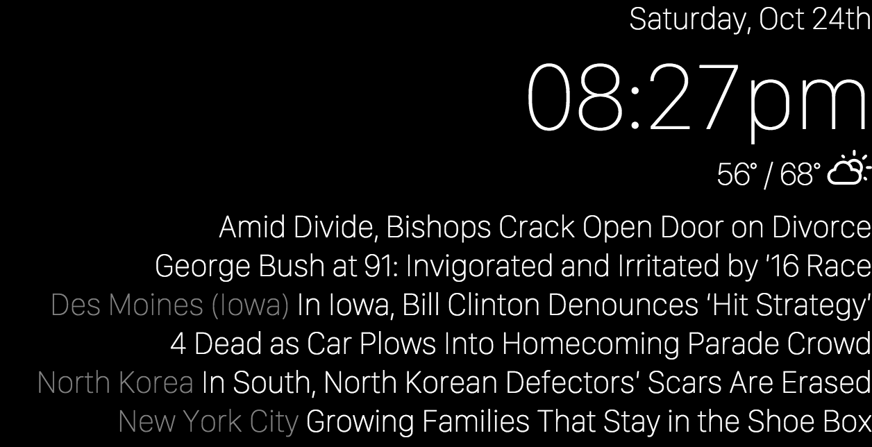 Web-based home mirror, inspired by Hannah Mitt's project.