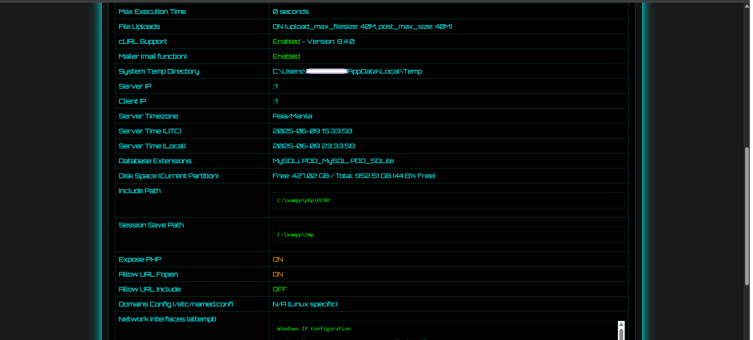phpinfo()in an isolated iframe for detailed PHP environment inspection.