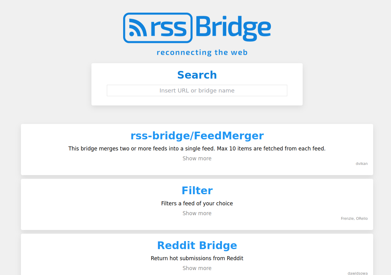 CssSelectorBridge: Scrape out a feed using CSS selectorsFeedMergeBridge: Combine multiple feeds into oneFeedReducerBridge: Reduce a noisy feed by some percentageFilterBridge: Filter a feed by excluding/including items by keywordGettrBridge: Fetches the latest posts from a GETTR userMastodonBridge: Fetches statuses from a Mastodon (ActivityPub) instanceRedditBridge: Fetches posts from a user/subredit (with filtering options)RumbleBridge: Fetches channel/user videosSoundcloudBridge: Fetches music by usernameTelegramBridge: Fetches posts from a public channelThePirateBayBridge:Fetches torrents by search/user/categoryTikTokBridge: Fetches posts by usernameTwitchBridge: Fetches videos from channelXPathBridge: Scrape out a feed using XPath expressionsYoutubeBridge: Fetches videos by username/channel/playlist/searchYouTubeCommunityTabBridge: Fetches posts from a channel's Posts tab