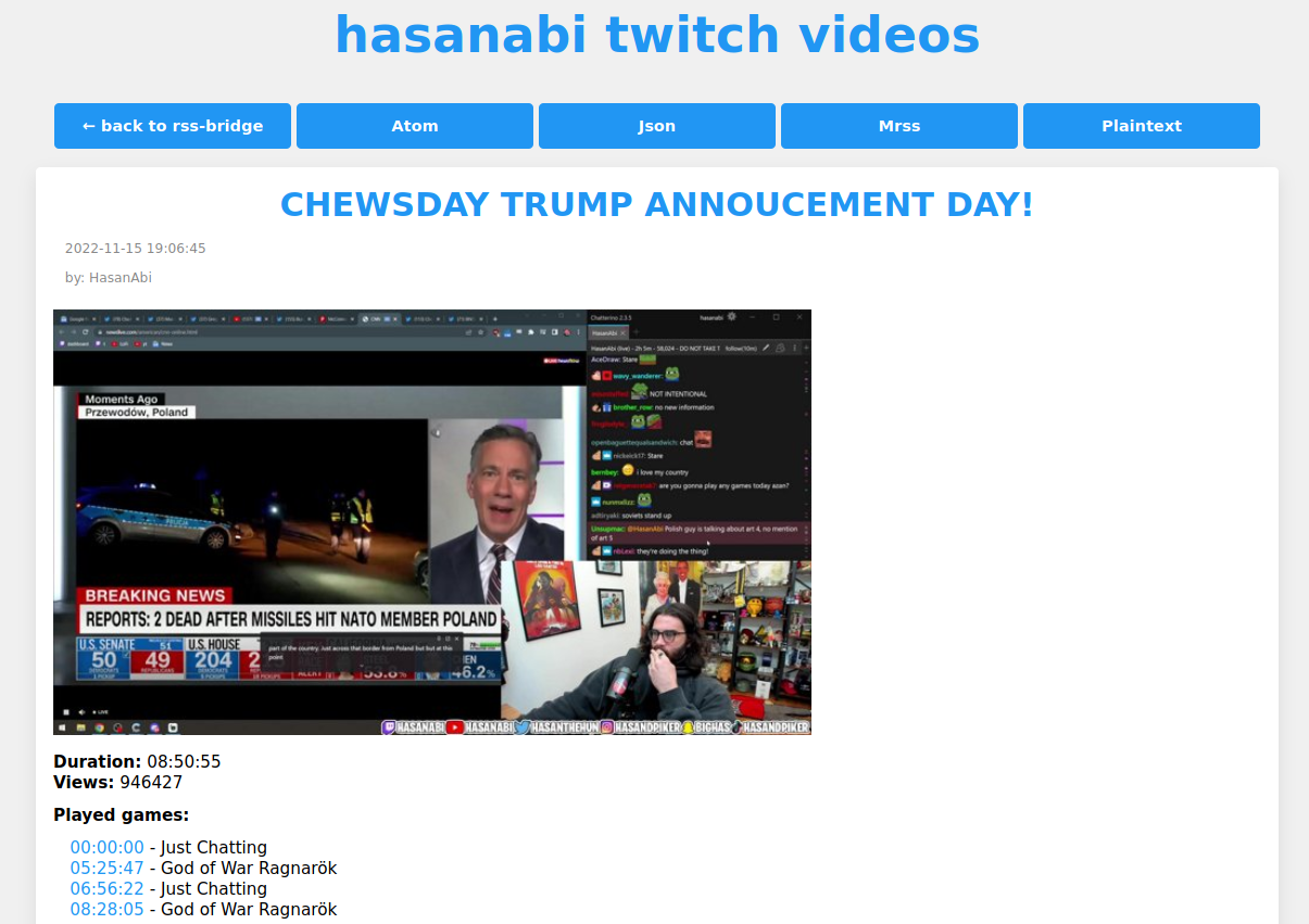 ]Atom: Atom feed, for use in feed readersHtml: Simple HTML pageJson: JSON, for consumption by other applicationsMrss: MRSS feed, for use in feed readersPlaintext: Raw text, for consumption by other applicationsSfeed: Text, TAB separated